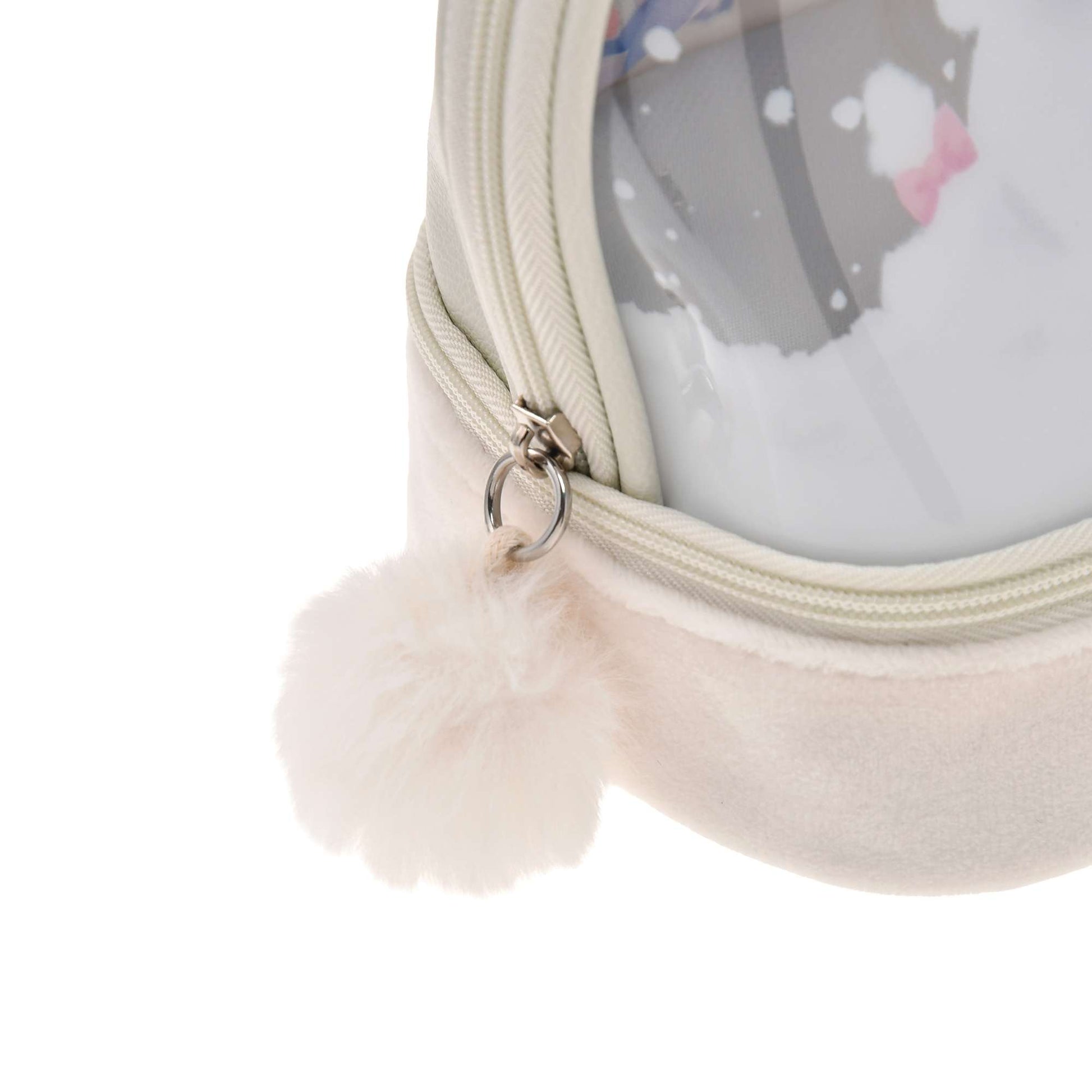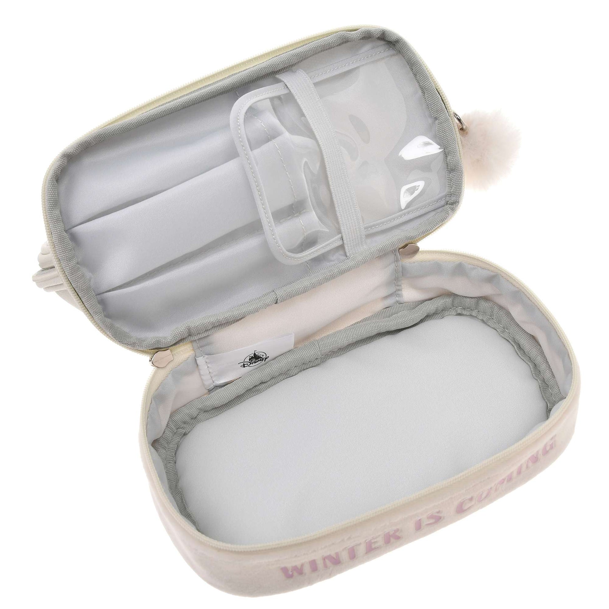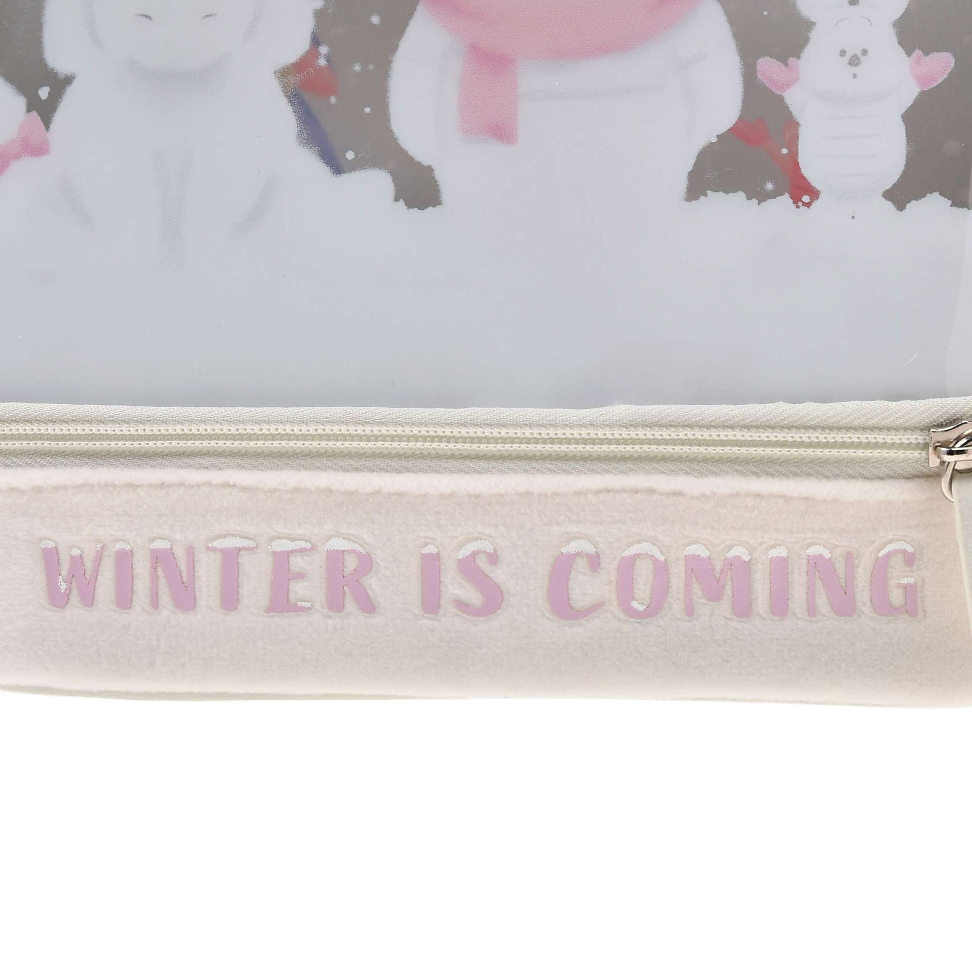 Le devant de la pochette, en tissu transparent imprimé de Winnie l'Ourson en blanc, les représente avant la chute des neiges.Le compartiment inférieur est en tissu brossé, imitant la neige. Le logo « L'HIVER ARRIVE » représente également un tas de neige. Un